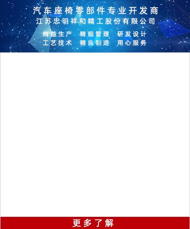 江苏忠明祥和精工股份有限公司创建于1988年,三十年来,从常熟市忠明汽车零件有限责任公司,转型升级与新加坡祥和科技合资组建成立“苏州忠明祥和精工有限 公司”中外合资企业,并于2014年筹备上市工作,完成股改更名为江苏忠明祥和精 工股份有限公司。总部位于常熟市高新技术产业园内,是一家专业从事汽车座椅零 部件研发、制造和销售的公司,苏州名牌产品,江苏省著名商标,江苏省高新技术企业。
